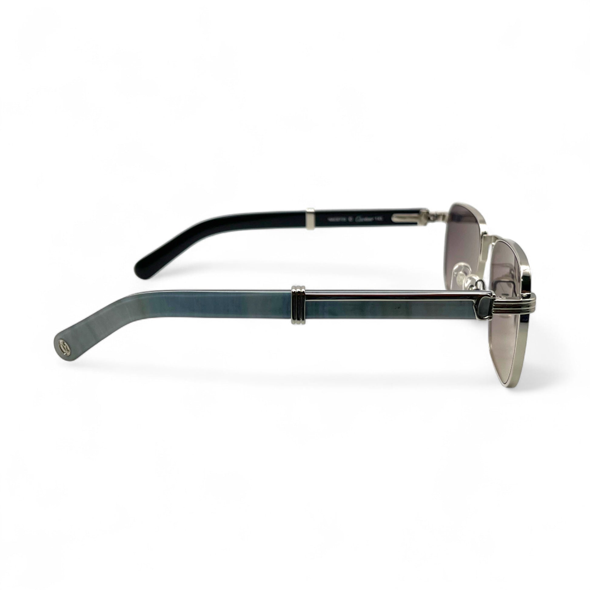 This Premiere sunglasses feature a full silver/gold frame with real wood/genuine horn temples and dark gray square lenses.