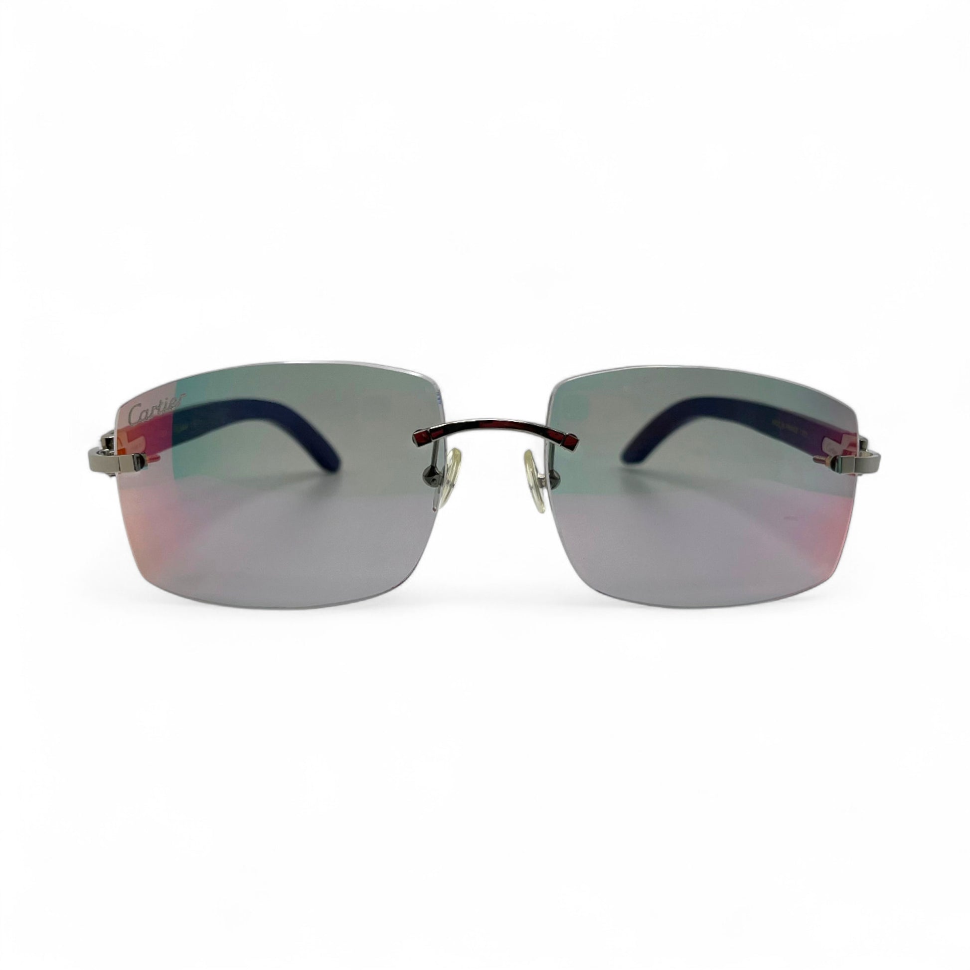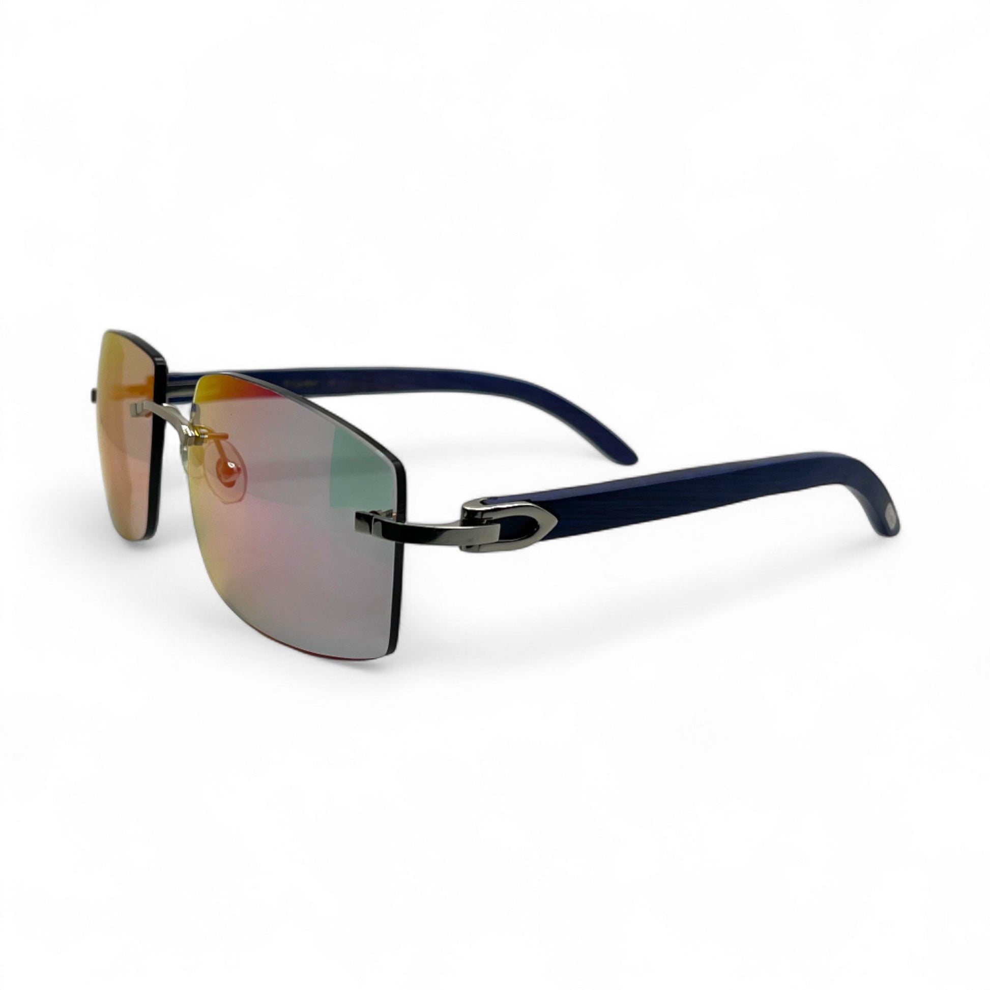 This C Decor Woods variant comes with a silver rimless frame, cobalt blue wood temples and Transitions Revo #6 lenses with a mirror finish.