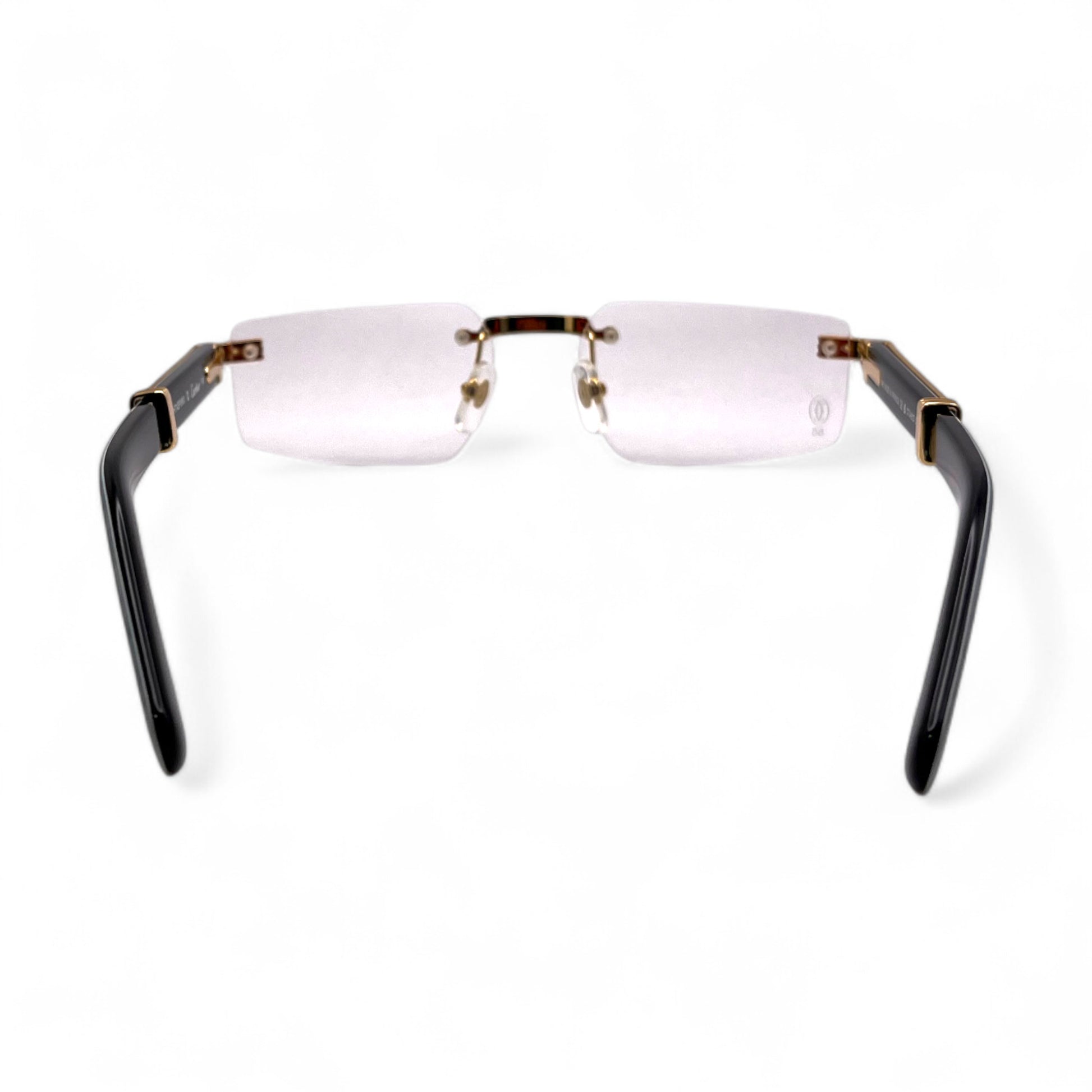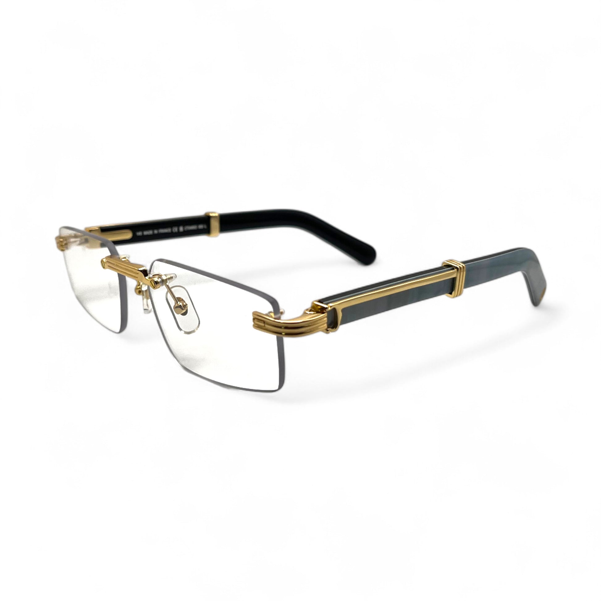 This eyeglasses comes with a gold rimless frame, genuine white horn temples (black inside) and clear lenses.